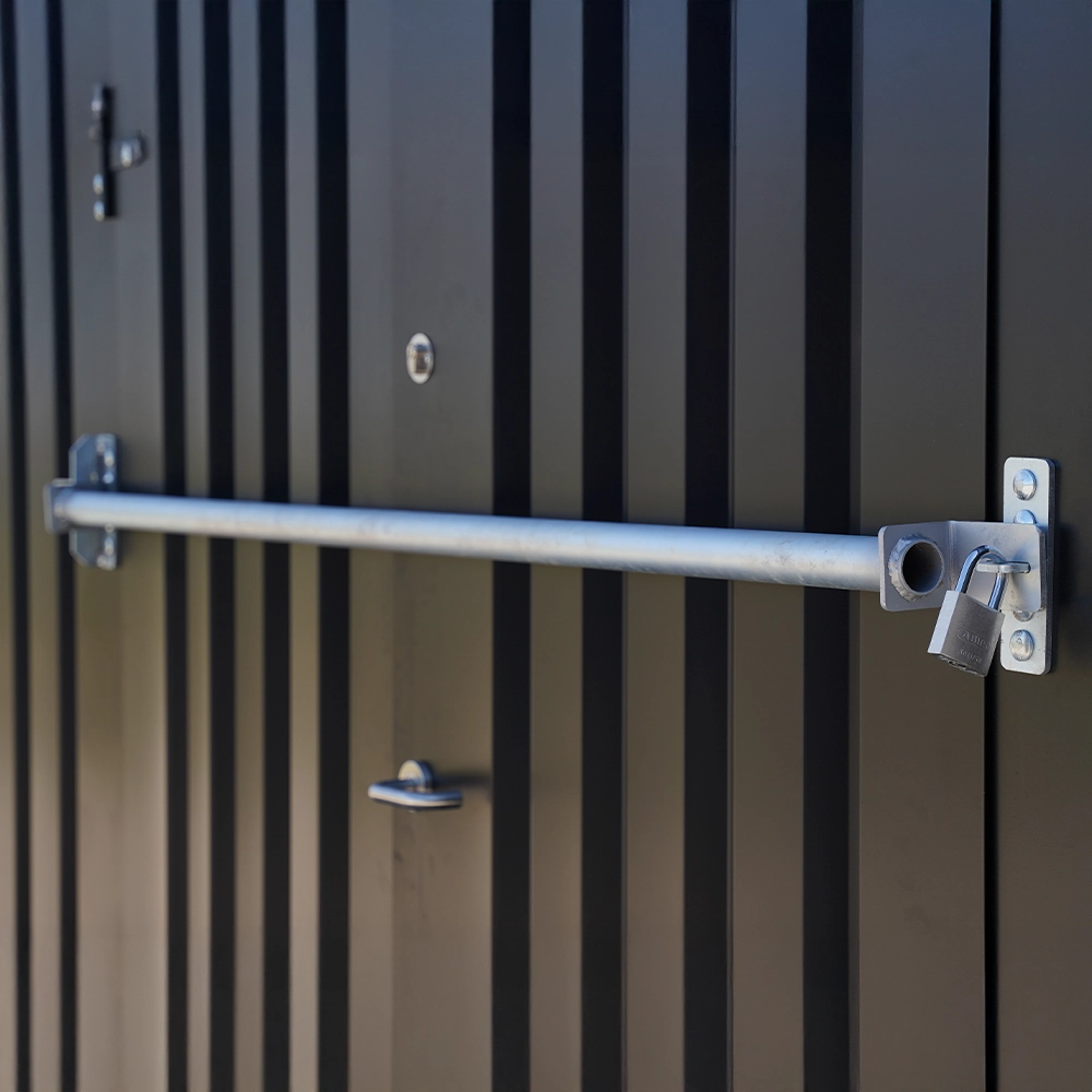 Wir bieten FOCO-Container an, die den höchsten Sicherheits- und Undurchdringlichkeitskriterien entsprechen und sich dennoch leicht zerlegen und wieder zusammensetzen lassen. Für diese Sicherheit bieten wir auch ein einzigartiges Werkzeug an, das Diebstahlsicherungsschloss für abnehmbare Barcontainer. Diese Sperre wurde speziell für den Einsatz in unseren Produkten entwickelt, egal ob sie eine oder zwei Türen haben. Um Kriminelle und Unbefugte vom Container fernzuhalten, muss die Einbruchsicherung an den Seiten befestigt und mit einem Vorhängeschloss oder Zylinderschloss verriegelt werden. Das Schloss ist aus dem gleichen verzinkten Stahl wie der Container gefertigt, so dass Sie nicht befürchten müssen, dass das Sicherheitsschloss rostet.