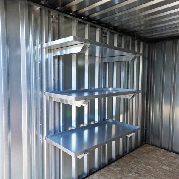Die Regale können als Werkbank oder Werkzeugablage genutzt werden, wenn der Container als Werkstatt im Garten genutzt wird. Wird der Verkaufscontainer zur Aufbewahrung von Akten genutzt, können die Regale zum sorgfältigen Ordnen aller Dokumente verwendet werden. Wird der Verkaufscontainer für ein Projekt oder auf einer Baustelle eingesetzt, können die Regale auch zur Aufbewahrung von Werkzeugen oder Bauzeichnungen genutzt werden. Mit den Einlegeböden ist Ihre Containerbar eine perfekte Ergänzung für jeden Verkaufscontainer und kann auf vielfältige Weise genutzt werden. Wenn Sie nun planen, den Verkaufscontainer zur Erweiterung Ihres Restaurants oder Ihrer Bar zu nutzen, sind diese Regale die ideale Option, um hier Gläser, Getränke oder Ähnliches abzustellen. Containerregale bieten nicht nur einen coolen Industrie-Look, sondern Sie müssen sich auch nicht mehr um die Montage dieser Regale kümmern. Mit dem einfachen „Snap-in“-System können Sie die Containerregale innerhalb von Sekunden an den Wänden des Containers befestigen.